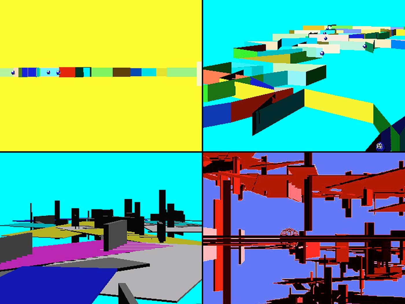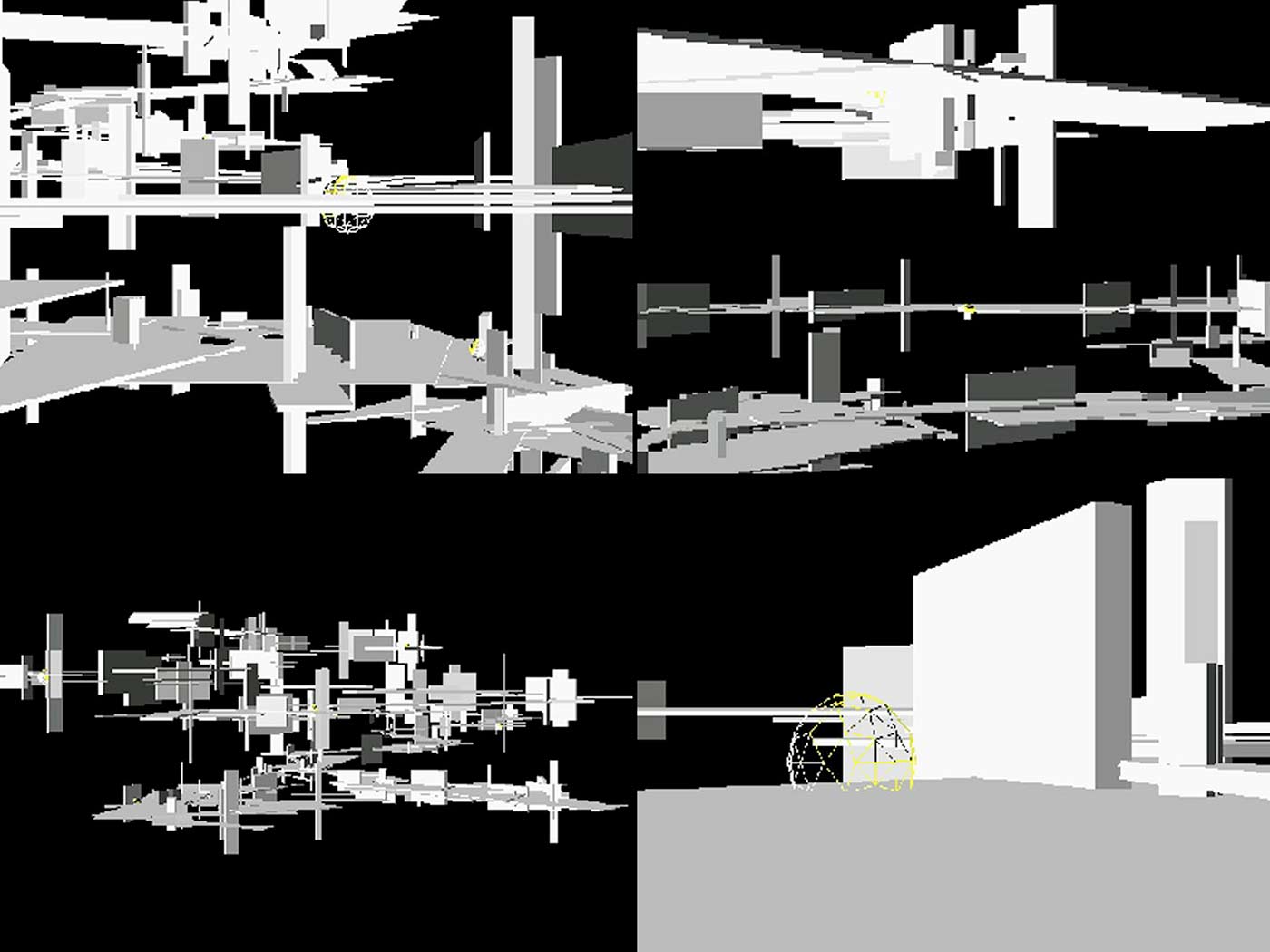 Auf der Basis fraktaler Prinzipien generierte dreidimensionale virtuelle Landschaft aus zusammenhängenden kubischen Elementen, die Bilder erzeugen, die entfernt an die räumlichen Systeme urbaner Strukturen erinnern.